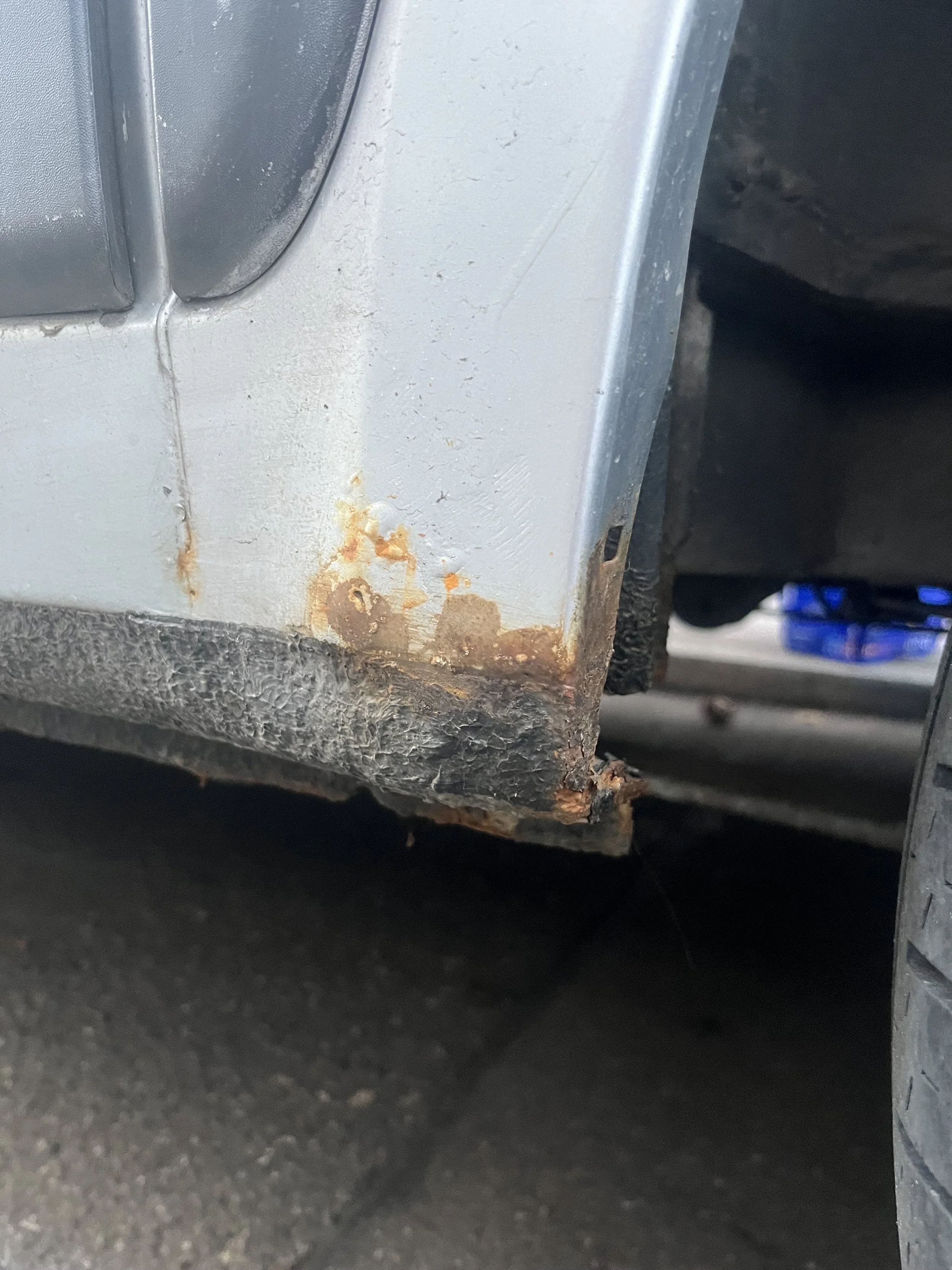 Der nächste große Schritt führte uns nach Moosburg zu Mike, dem einzig wahren Schrauber-Held mit Herz und Hebebühne. Gemeinsam rückten wir dem Rost zu Leibe. Flex in der Hand, Schutzbrille auf (meistens), und los ging’s. Die betroffenen Stellen wurden entrostet, geschweißt und anschließend mit Grundierung, Lack und Bitumenspray versiegelt. Mike nannte das Bitumenspray liebevoll “Batz“